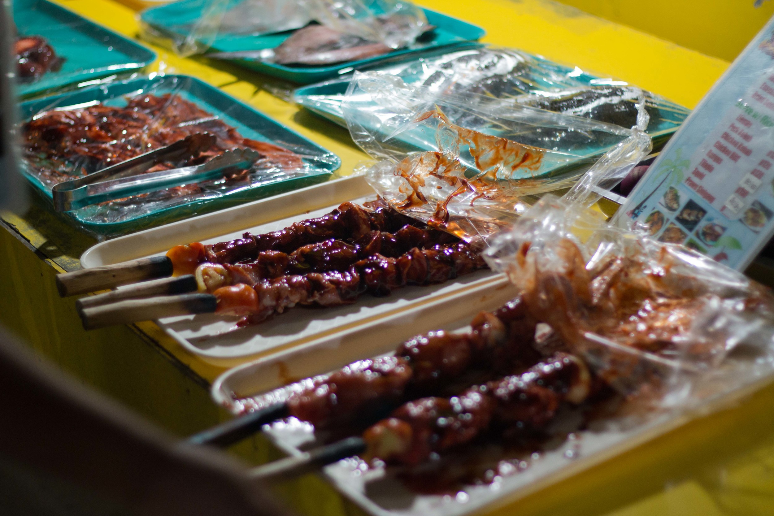 We got dinner at one of the places along the beach. The water isn't really safe to drink in the Philippines, but we will usually give cooked food a go. We ordered a a couple different skewers of meat, chicken and pork, some soup, grilled egg plant, pork belly (which is pretty much bacon, but so much better) and a (whole) fish. It's all served family style with rice. What we didn't know until after we were done eating was that it's customary to eat with your hands in the Philippines. Since we were not aware of this, we ate with a knife and fork. When Aaron and I travel, we try to not only eat the local food, but also the way in which locals eat. Had we known, we would have been all for it. Oh well, next time....