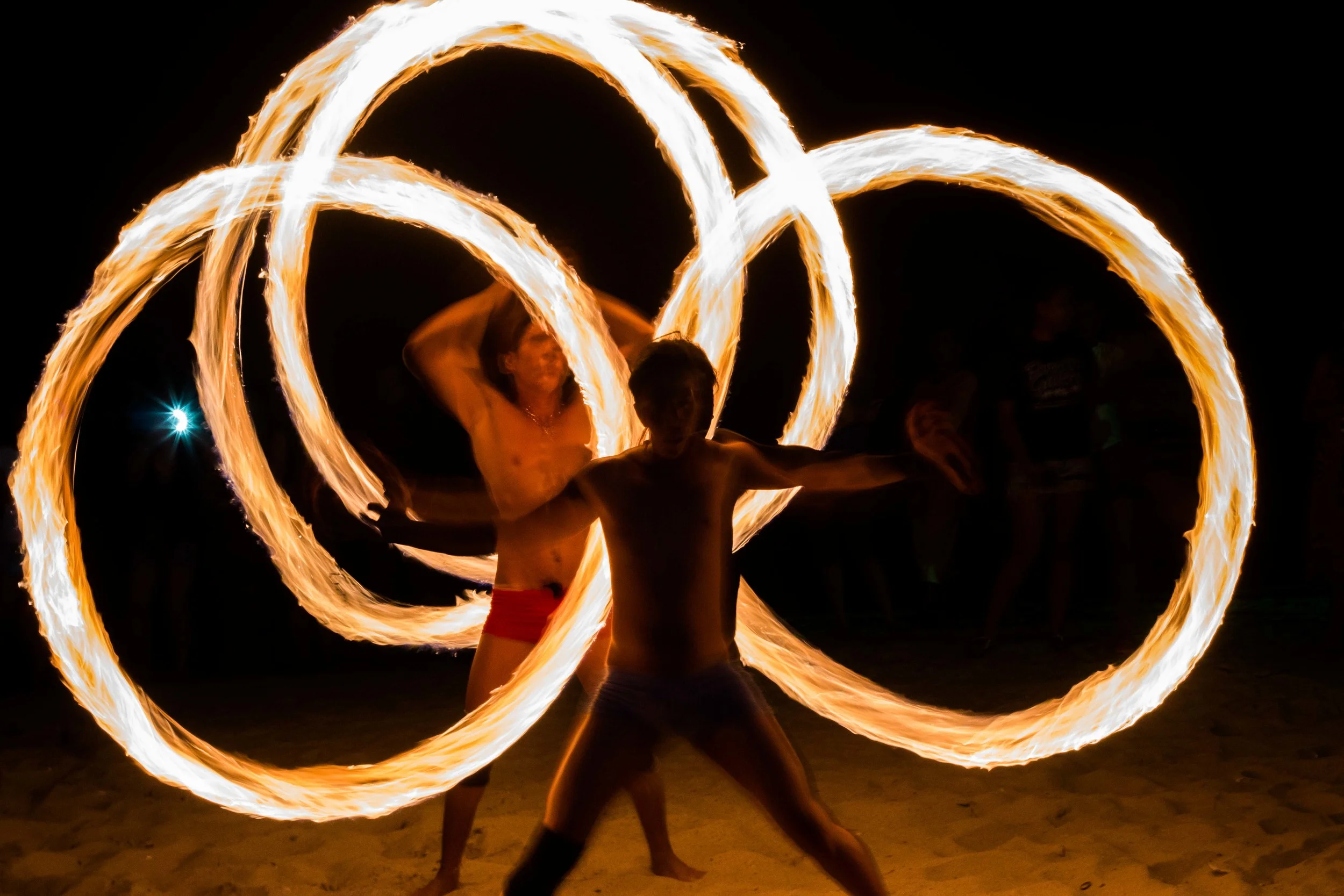 And then it was time for the shows to start. This was quite the experience! The first part was a group of three fire dancers. Basically, they are swinging around these balls dipped in some sort of fuel (kerosene maybe) that are lit on fire. It takes some serious talent to do what they were doing and not burn the crap out of yourself. We only watched one of them catch his hair on fire over the course of the whole night.