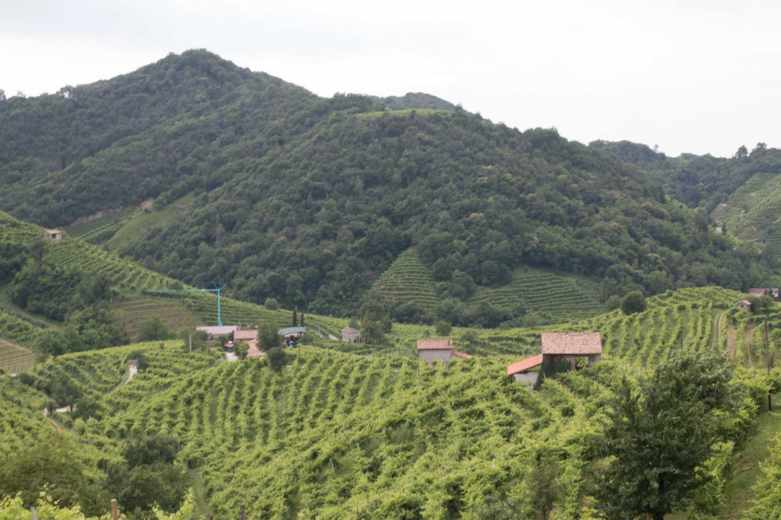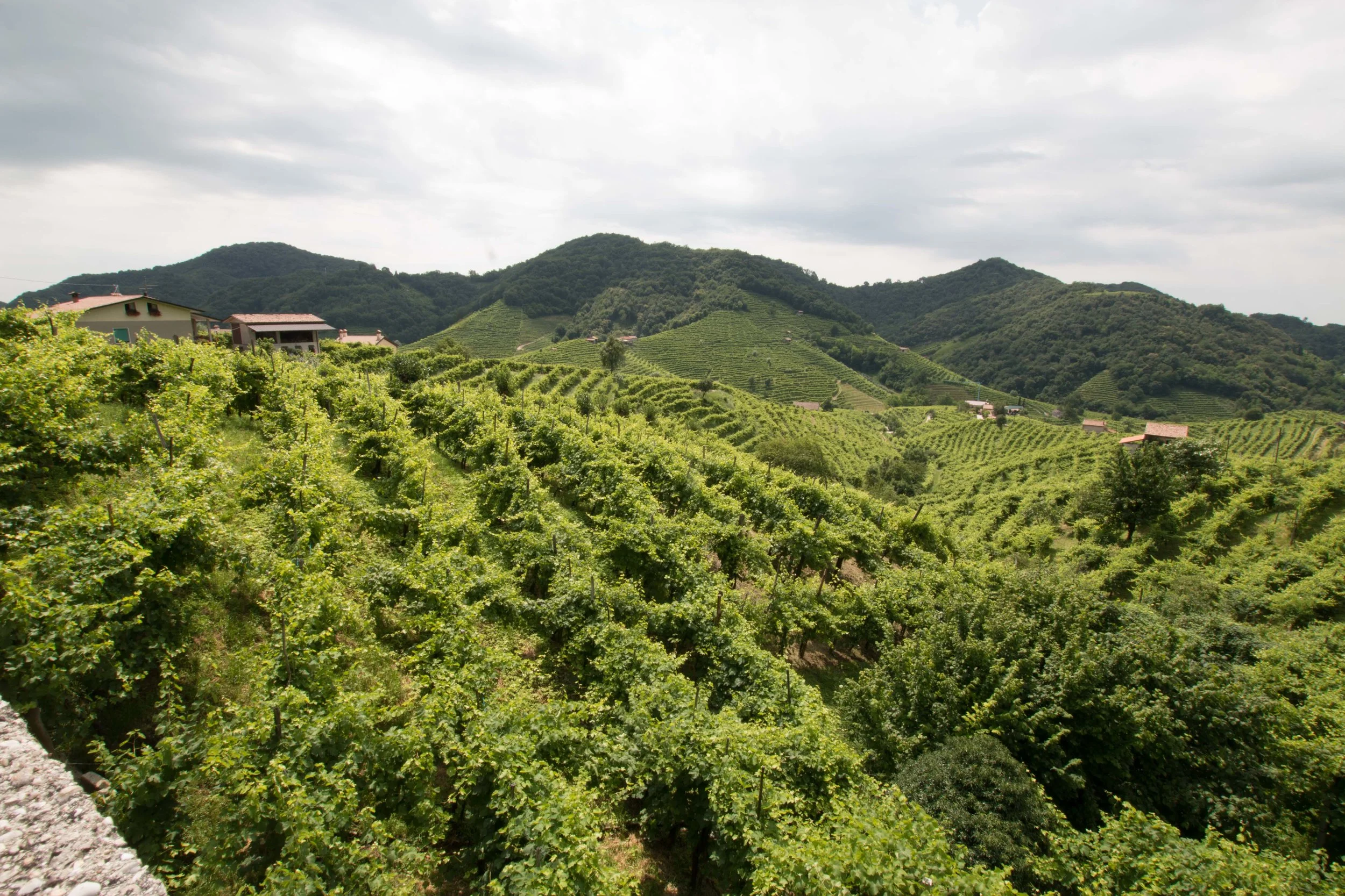 The vineyards terraced tightly onto othe gently rolling hills along the Prosecco Road
