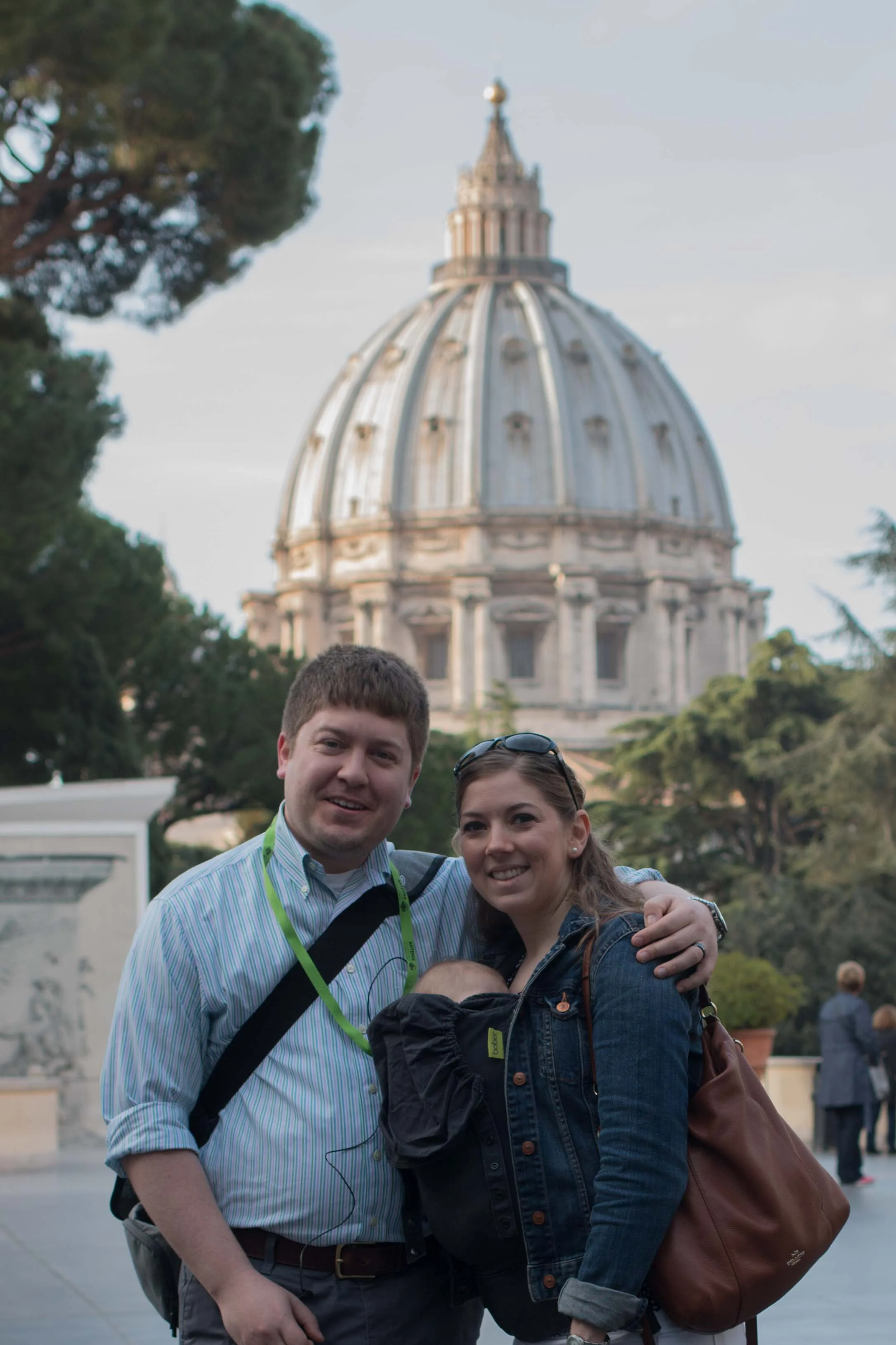 The tour starts at 7:15 in the morning. With a 2.5 month old, that's definitely an early morning. We met at a Piazza near the Vatican where we then walked to the entrance to the Vatican Museums. We were able to bypass most of the line, joining other guided groups in line for when the museums "pre-opened" at 8:00. One of our first stops once inside the complex was a patio with a beautiful view of St. Peter's Dome. Of course we had to take a family picture! Too bad Evelyn won't remember any of the cool places she is visiting, but at least we have pictures to prove she was actually there.
