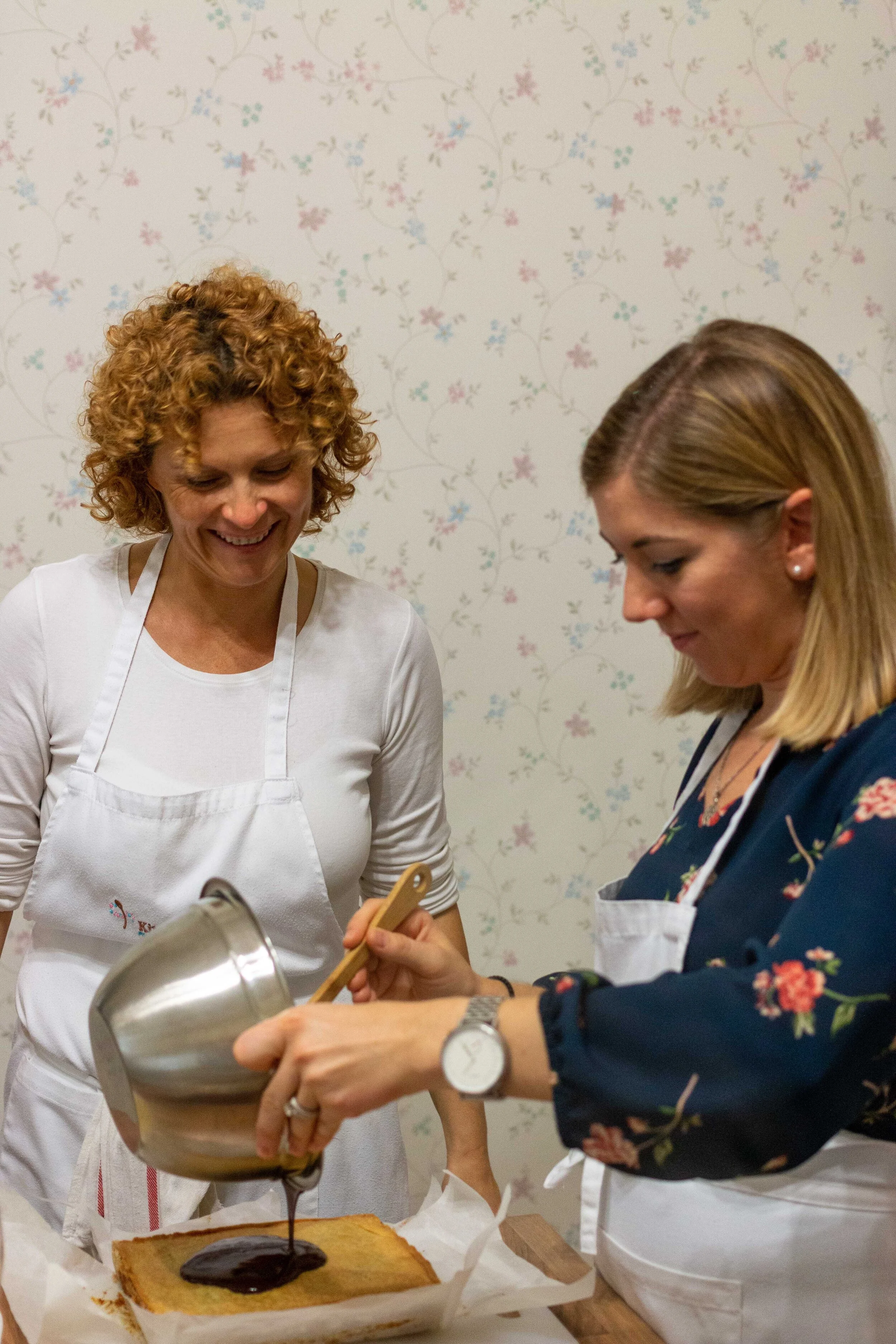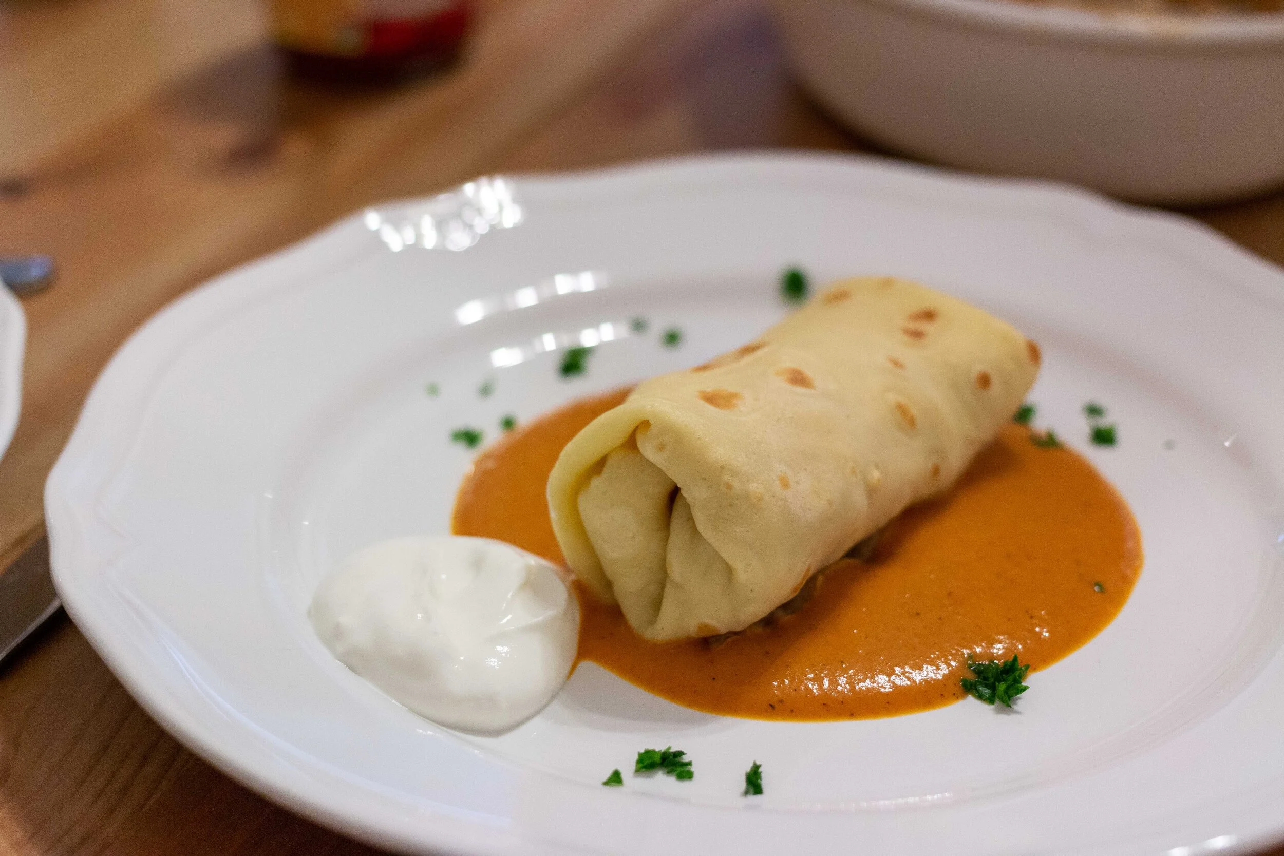 Almost like magic (because I struggle deeply with this), the meal came together at the same time. The goulash was complete, the crepes and filling were ready, and the cake just coming out of the oven. We sat down to consume the fruits of our labor. The goulash was delicious - hearty and savory, almost a meal of it’s own. As we sat there sipping the soup, Marti revealed that soups are a staple in Hungarian meals. They eat soup every day; cold soups similar to a gazpacho in the summer, heartier soups like goulash in the colder months. Once we finished our soups, we tucked into the stuffed pancakes. At the table, Marti demonstrated how to roll them up by placing a serving of the chicken on the pancake and rolling it like a burrito. She then ladled some sauce onto a plate and placed the stuffed pancake - which very much resembeled a burrito - on the sauce, with a dollop of sour cream on the side. Oh. My. Gosh. So delicious! I wish I could describe it, but words are failing me although, my mouth is watering in memory.