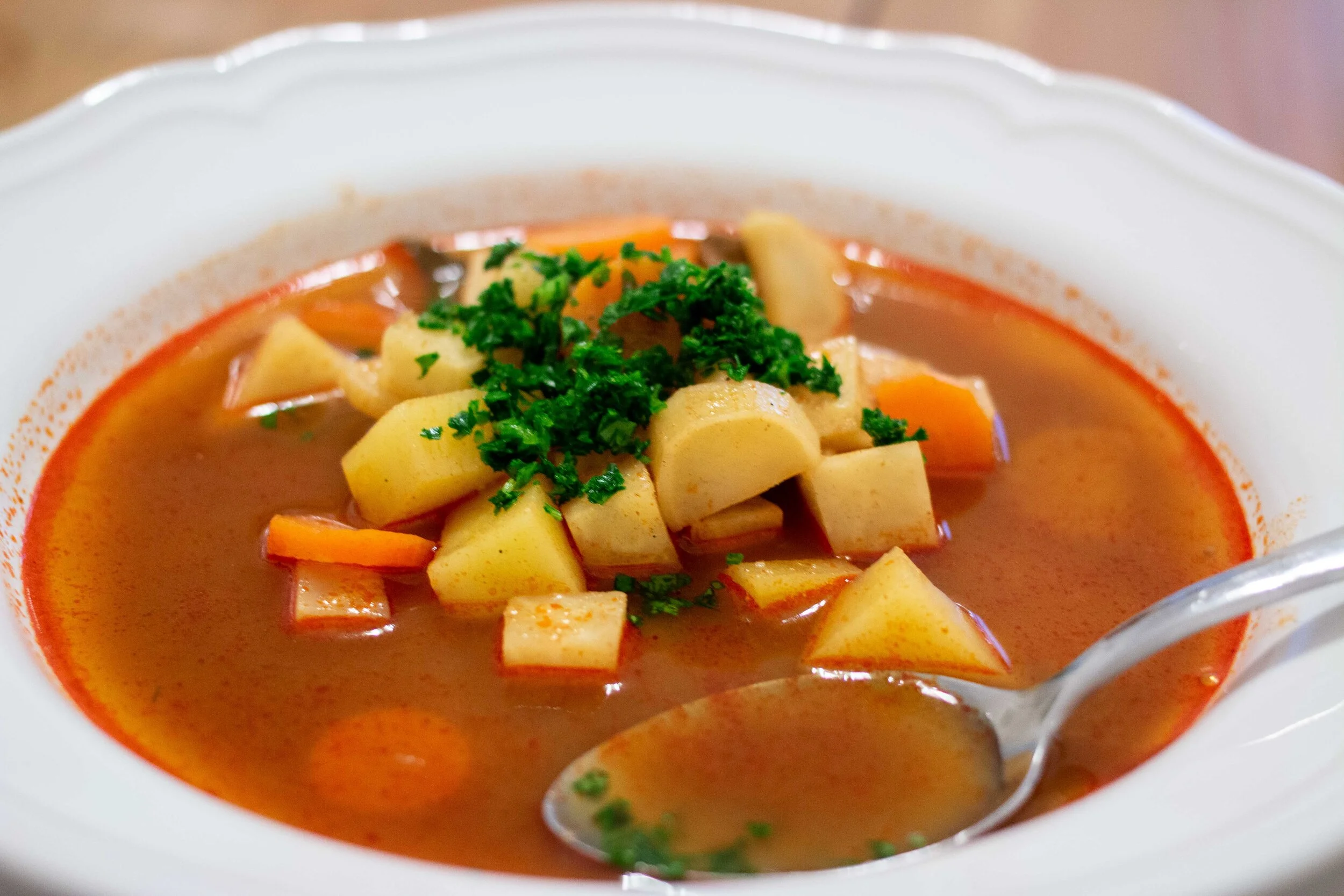 Bundled in jackets and scarves, we met on a delightfully cool, crisp, sunny fall morning in front of the 100 year old market. After making brief introductions, we began to wander. I’m always astounded at the sheer variety of food available at markets - so many different cuts of meat that just simply aren’t availble in my local grocery store, the high quality produce, and local specialty items. It wasn’t long before I felt a nostalgia for the weekly market in Mannheim. As we wandered, stopping at stalls here and there to purchase a few items, Marti began to share some stories with us. She explained that she had grown up on a farm in the country and that her parents still resided there. Many of her recipes are family recipes with some modern adaptations. As we passed by a stall selling chicken (which we stopped at to purchase the chicken we needed), she noted that all parts of a chicken are used - many are consumed, in one way or another, while others are used to prepare broths, still others are used as flavorings. We stopped to sample fried pork fat, which is akin to cracklins or pork rind. At another stall selling cooking implements, she told us that in the more rural parts of Hungary, goulash (which I’m pretty certain is the national soup of Hungary!) is traditionally prepared outdoors, over an open fire.