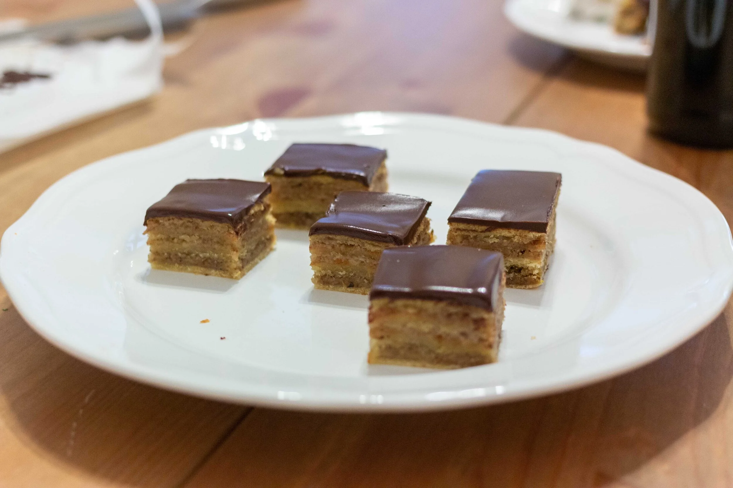 Our bellys getting full, we still had dessert! The gerbeaud cake is a layered cake. It has a layer of pastry, then a thin spread of preserves (we used homemade apricot preseves, courtesy of Marti’s mother in ours), then a layer of walnuts. The layers are repeated many more times. After it is baked, it is topped with a chocolate ganache. It’s supposed to be chilled for a while, prefereably overnight, before being served. But we did not have the luxury of time to do so. Marti carefully cut the cake, taking care to wipe her knife in between each cut to ensure a clean slice, and placed the pieces onto a plate for us to help ourselves to.